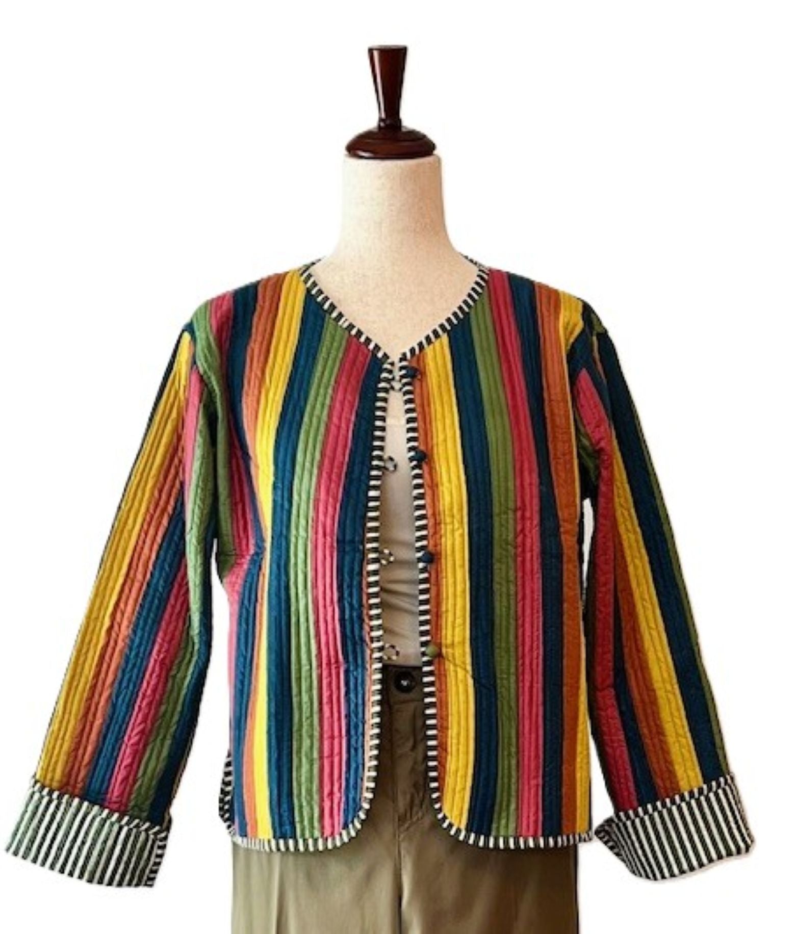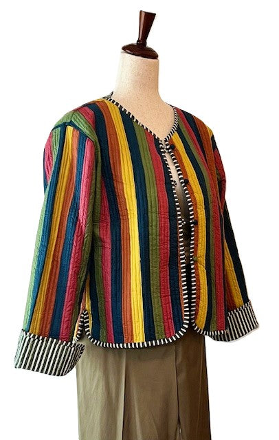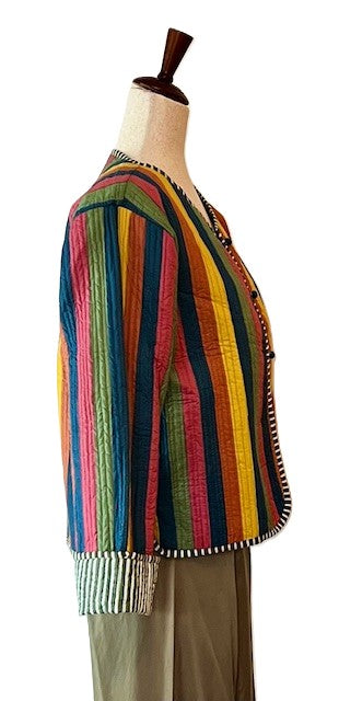 Short Cotton Quilted Handmade Jacket, Fully Reversible is stunning. Multi colored striped against a white background is fresh and feminine. Handmade, block printed, quilted, striped pattern, covered buttons down the front. Styled in a short blazer jacket resting just below the waist. Long sleeves with split seam, fold back cuffs exposing the reverse print in a pink and white stripe. Fully reversible in a pink white stripe with kantha stitching. Nice designer detailing.