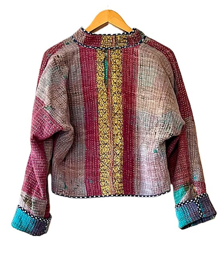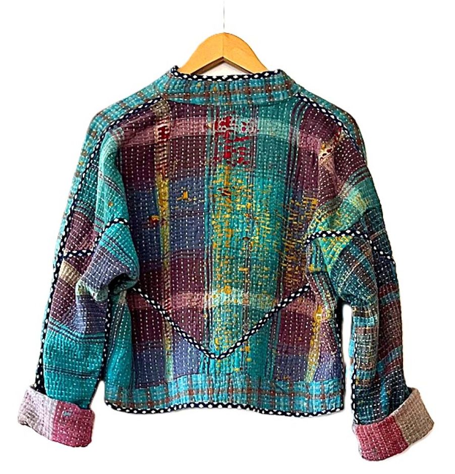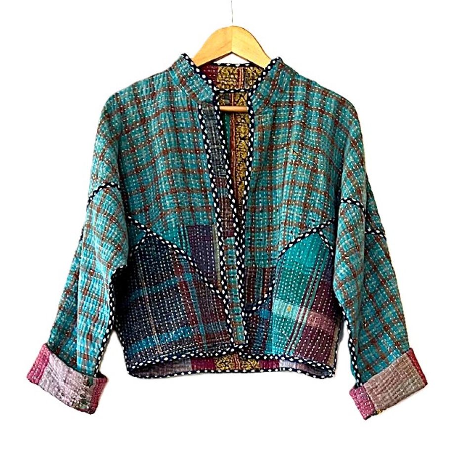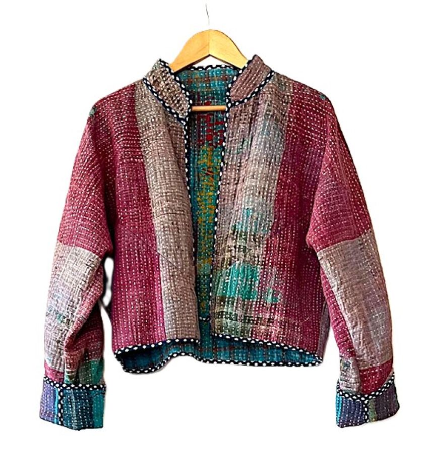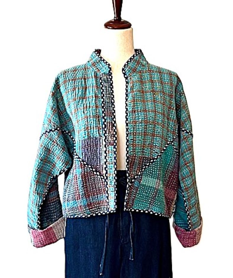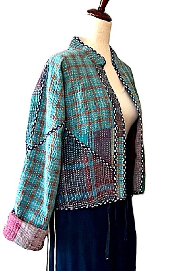 Short Quilted Baseball Style Jacket Is Handmade And Fully Reversible. We love the colors on either side, trim detailing, and cut. This beautiful kantha stitched jacket is made from vintage kantha cloth. It has a wide, loose open body with lapels. 3/4 sleeve amy be folded to your desired length. Two functional front pockets make this easy jacket a new basic for your wardrobe. Nice designer detail, an engineered border runs the hem of the front panels. We love the trimmed down body, shorter length and sleeves. Perfect cut for year round use. Expert detailing throughout the garment. Finsihed rolled piping finishes the sleeves. The Kantha jacket is a versatile garment to have in the wardrobe, combined with prints that can be easily styled. Each jacket is unique!
