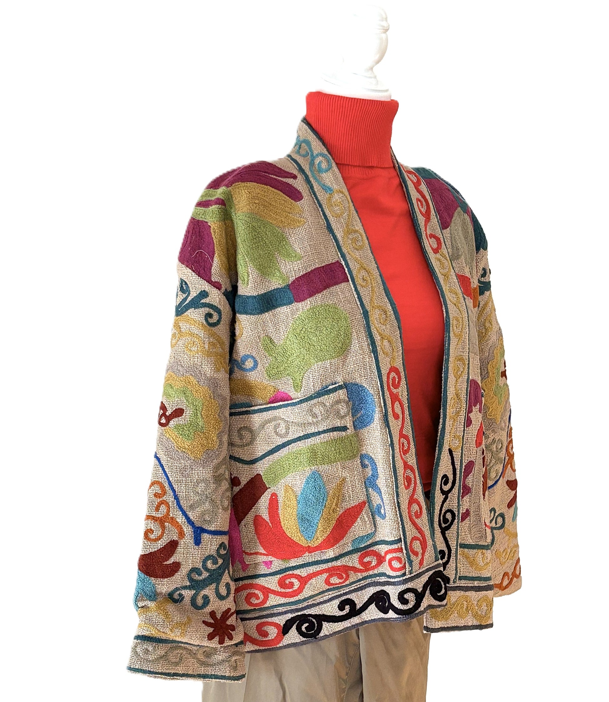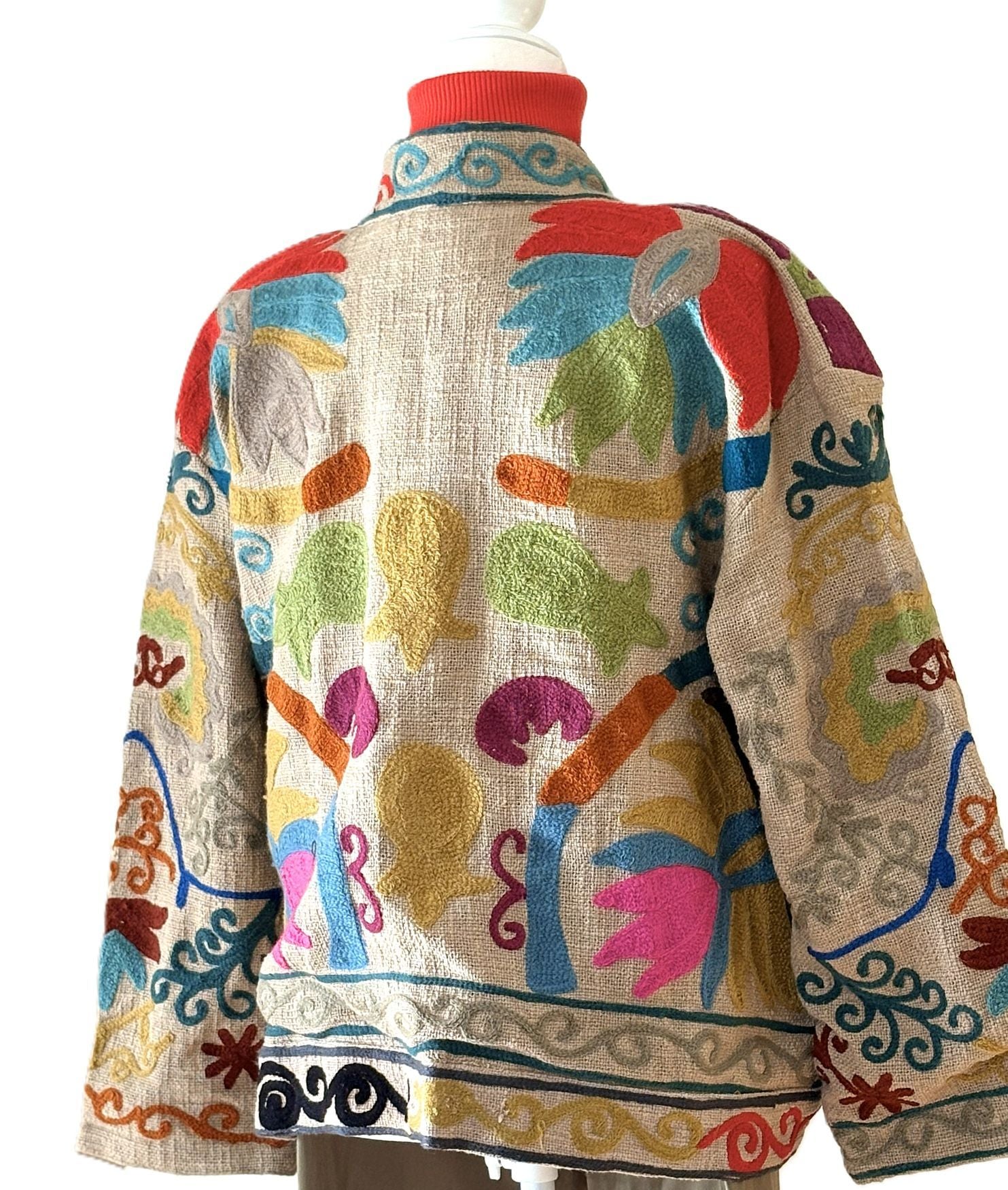 Exquisite craftsmanship handcrafted with intricate Suzani embroidery. Each stitch tells a story of tradition and elegance. 100% Cotton, hand embroidered on natural beige colored cotton with multicolored embroidery in primary colors. Tab collar, engineered front placket border, matching finish on hem and cuffs. Open box cut is comfortable and easy to wear. This jacket is not reversible but fully lined. The natural color elevates this jacket to a fashion position that can easily be dresssed up or down.
